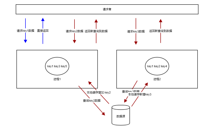 如上图所示,进程1不含有 key2,用户请求 key2 的 请求被分配到进程 1 上时,就会出现缓存击穿的问题,明明在进程2 上含有 key2 的数据,但是进程 1 感知不到。