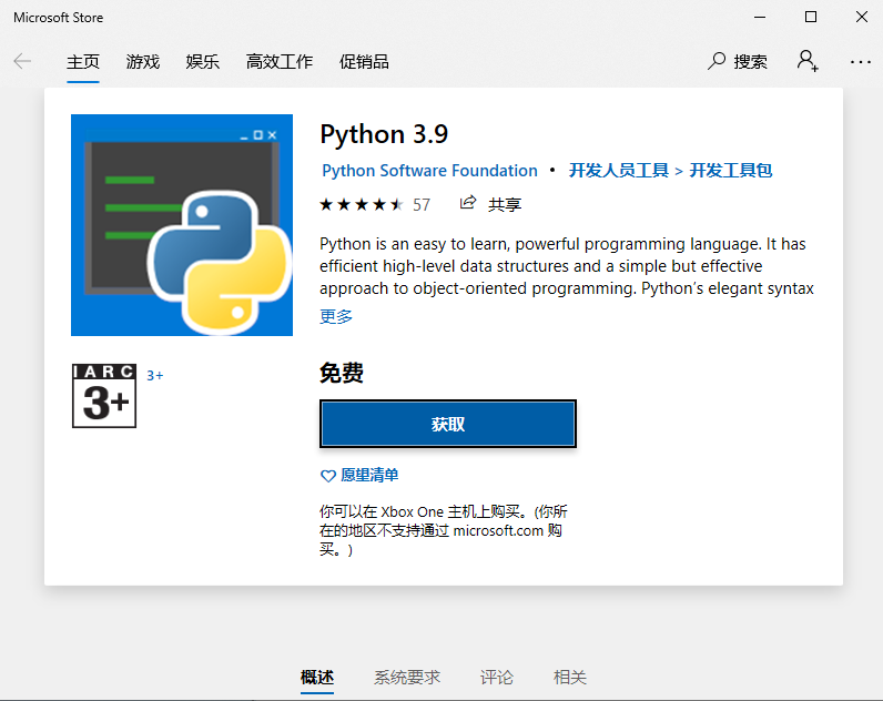 接下来是 python 的安装过程,直接在命令行中输入 python 命令,正常情况下会弹出 Windows Store 的安装界面,